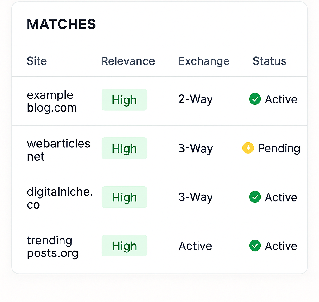 Stop guessing. Our algorithm scans semantic context to pair you with highly relevant sites in your specific niche. We ensure every match actually moves the needle.